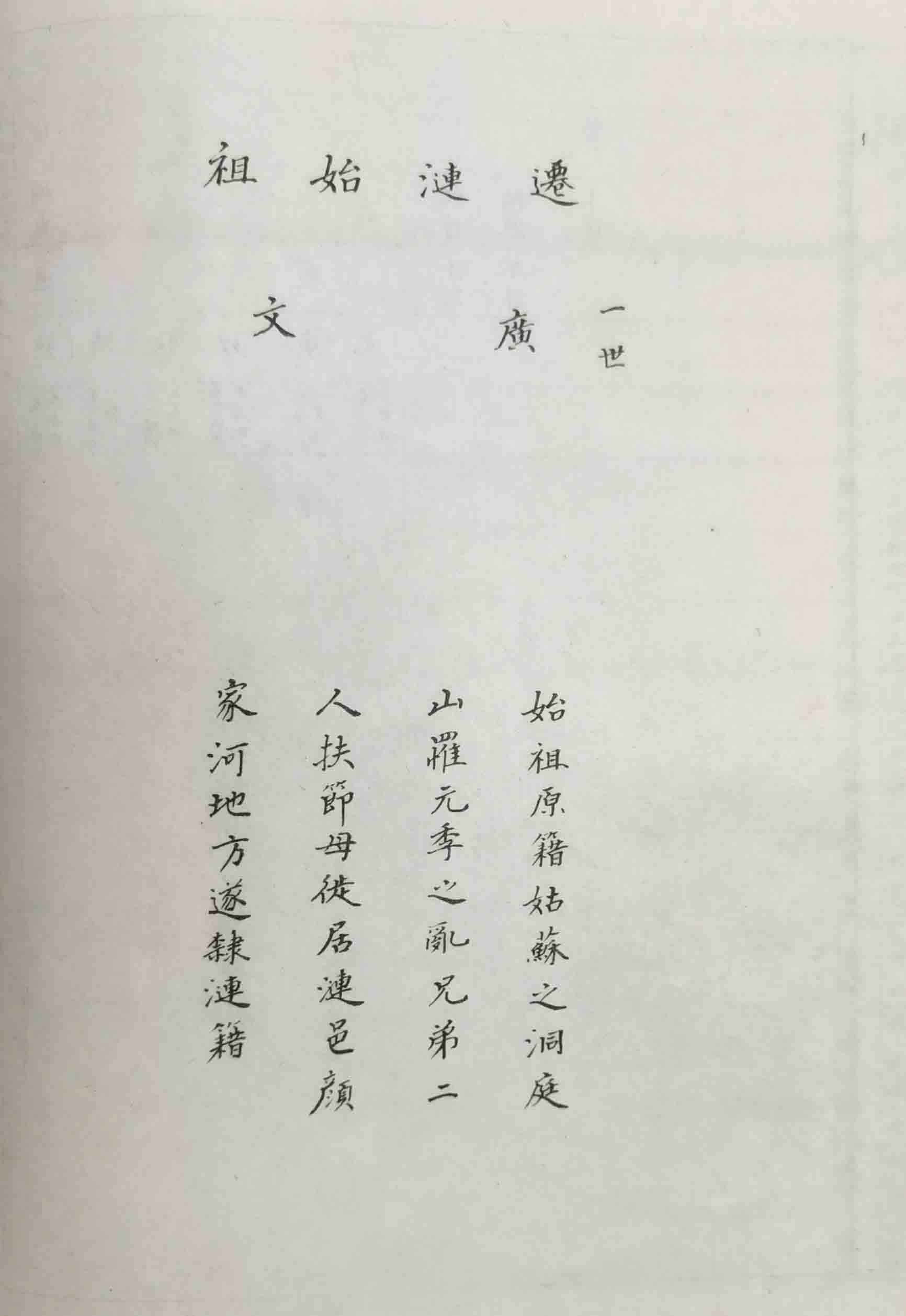 2、族谱共分两部分,迁徙涟水前和迁徙涟水后。涟水前,从蜀汉大都督姜维父亲姜诗续起,至三十八世姜广、姜文止,基本无从考证。元末明初战乱之时,节母携姜广、姜文两幼子自姑苏洞庭山迁徙至涟水颜家河北。洪武初年,按人口分田获荒田数百亩,自给自足,繁衍至今,已二十余世。