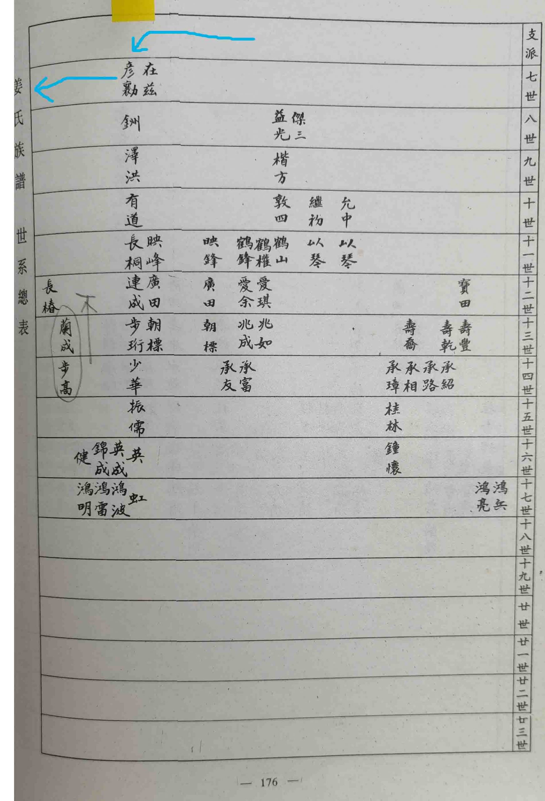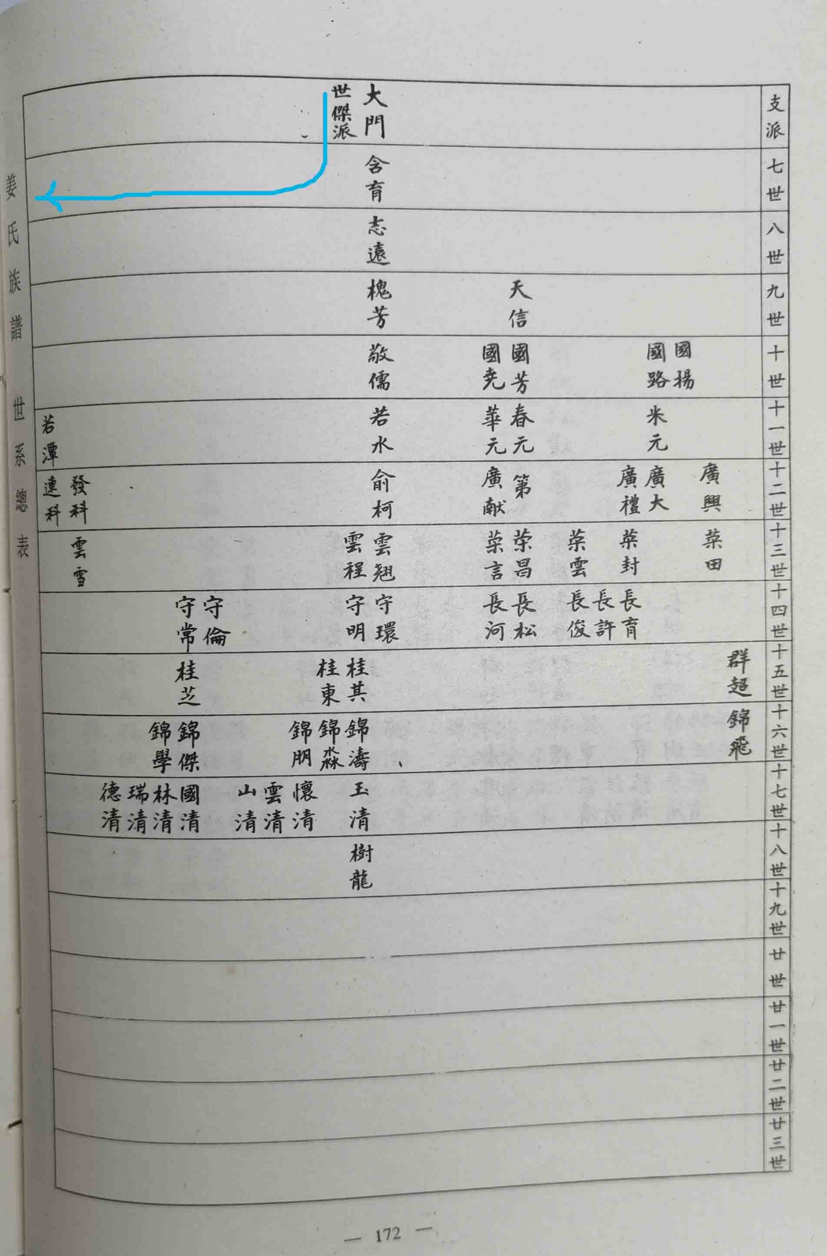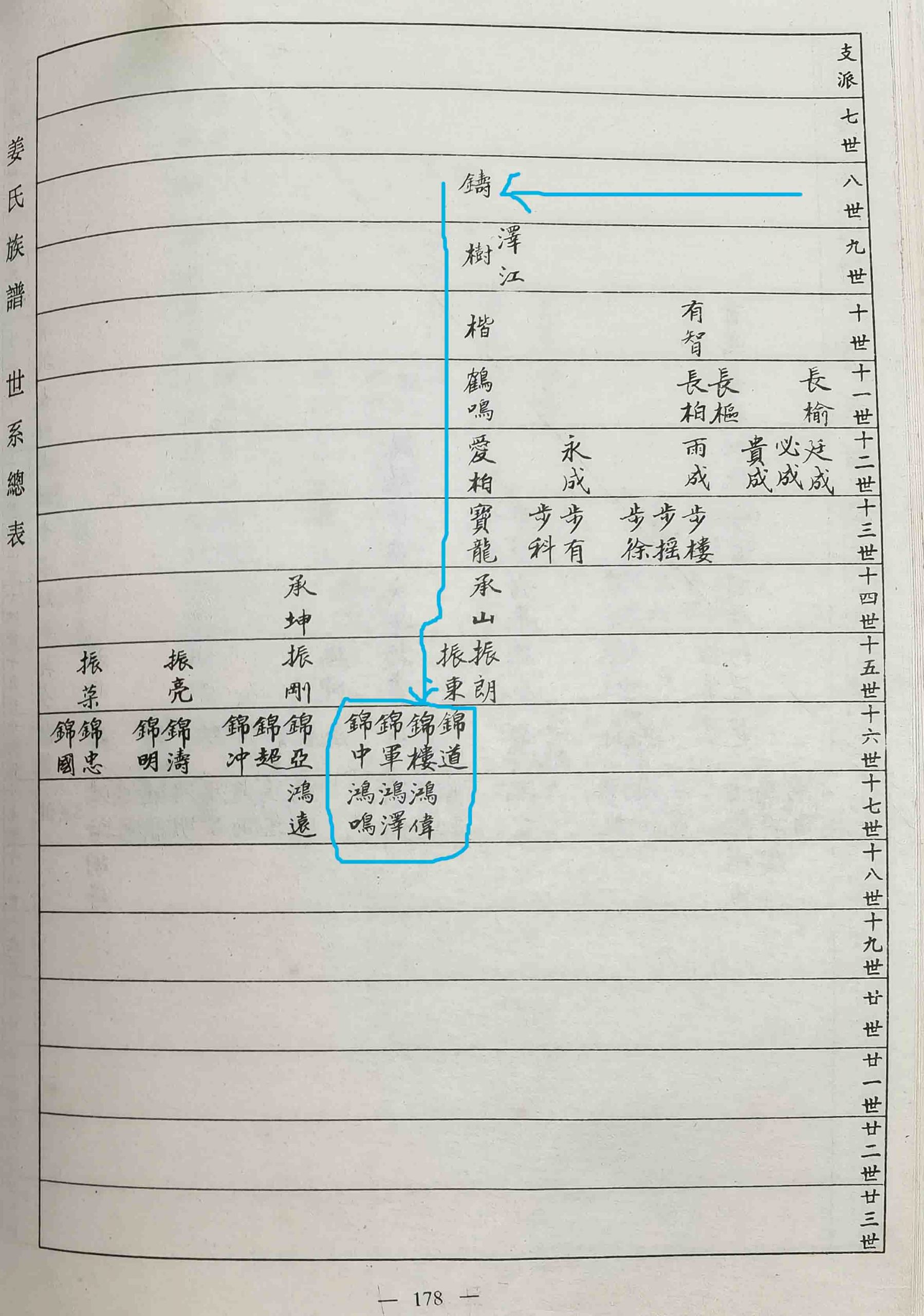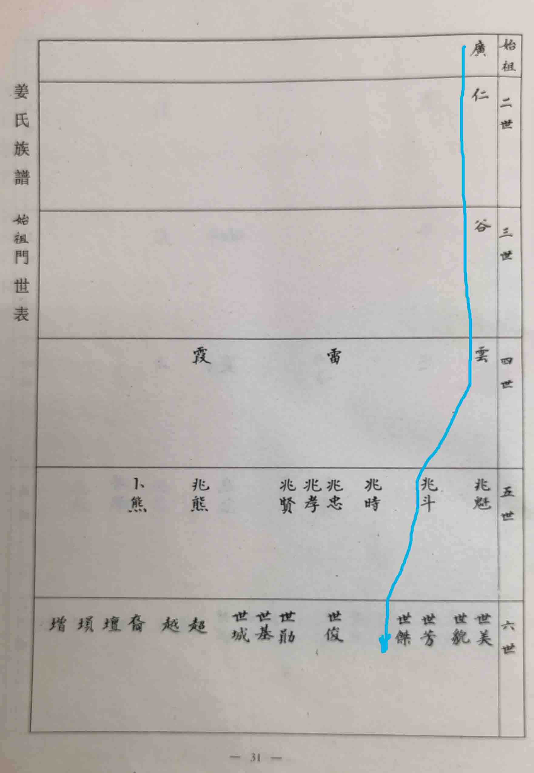 4、我们这一支,属大门仁公后裔。本人是锦字辈,十六世。广(1)、仁(2)、谷(3)、云(4)、兆(5);世(6)、彥(7)、铸(8)、泽【单名树】(9)、楷(10);鹤(11)、爱(12)、宝(13)、承(14)、振(15);锦(16)、鸿(17)、树(18)、炳(19)、增(20);镜(21)、洲(22)、懋(23)、爘(24)、基(25);伯(26)、庆(27)、鼎(28)、俊(29)、坚(30);宇(31)、泰(32)、少(33)、安(34)、富(35)。